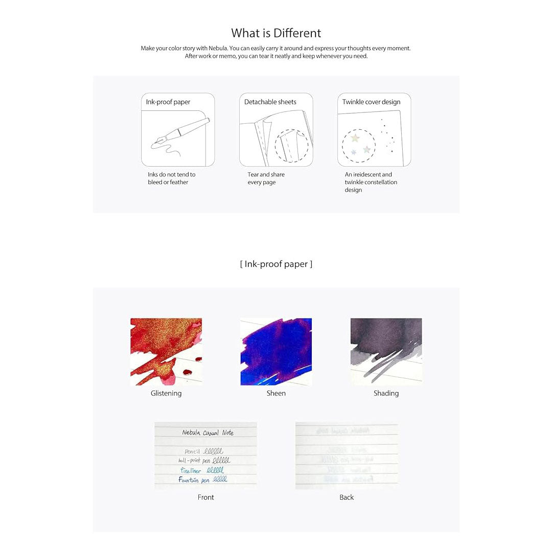 The Nebula Note Casual, which comes in three formats: ruled, dotted or plain (blank) pages, is made of high-quality papers and can be used with all types of writing instruments including fountain pens without compromise. Soft cover, ink proof paper tends not to bleed or feather, featuring an iridescent and twinkle constellation design. Designed by Colorverse, this notebook has perforated detachable sheets for easy tearing. Make your color story with Nebula. You can easily carry it around and express your thoughts. After work or memo, you can tear it neatly and keep whenever you need.