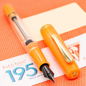 The Nahvalur Original Plus Fountain Pen - Halloween 2024 Limited Edition is a vibrant and festive writing instrument designed to capture the spirit of Halloween. Crafted from sparkling orange resin, it features gold trims and a black stainless steel #6 nib, combining aesthetics with functionality. This vacuum-filling pen is limited to 2,024 pieces, each individually numbered on the finial, enhancing its exclusivity.